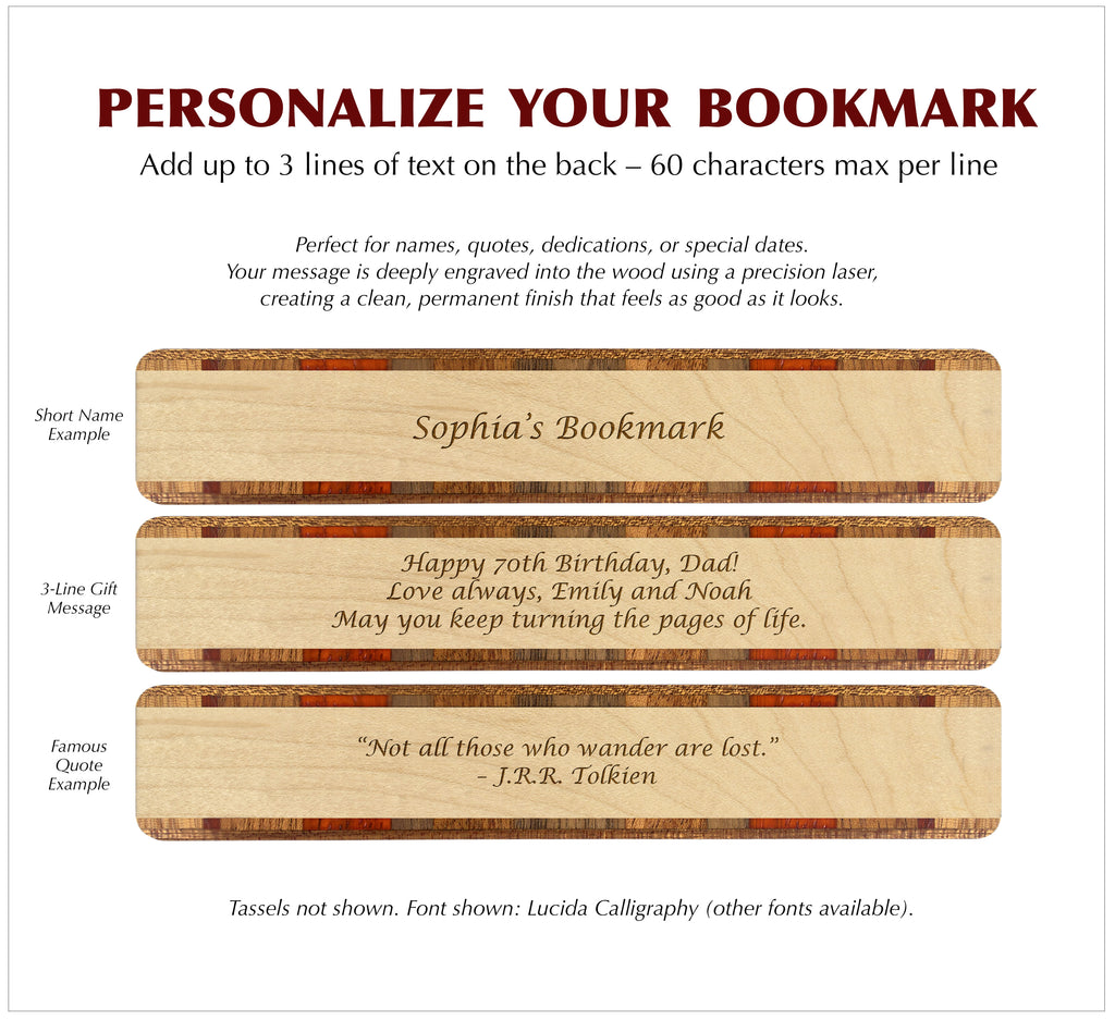 Customize the back with a laser-engraved message to create a unique and meaningful gift. Add a name, special date, or heartfelt dedication to make this bookmark truly special.